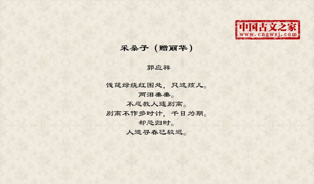 饯筵绿绕红围处,只这孩儿。两泪垂垂。不忍教人遽别离。别离不作多时计,千日为期。却恐归时。人道寻春已较迟。