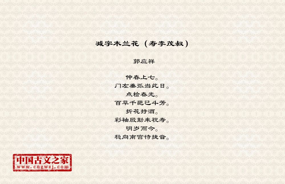 仲春上七。门左垂弧当此日。点检春光。百草千葩已斗芳。折花持酒。彩袖殷勤来祝寿。明岁而今。稳向南宫待捷音。