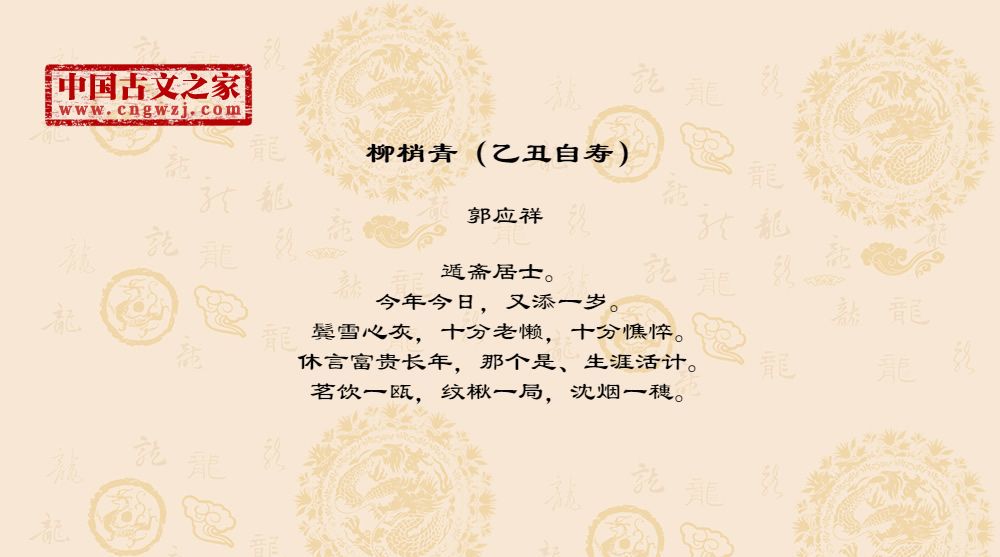 遁斋居士。今年今日,又添一岁。鬓雪心灰,十分老懒,十分憔悴。休言富贵长年,那个是、生涯活计。茗饮一瓯,纹楸一局,沈烟一穗。