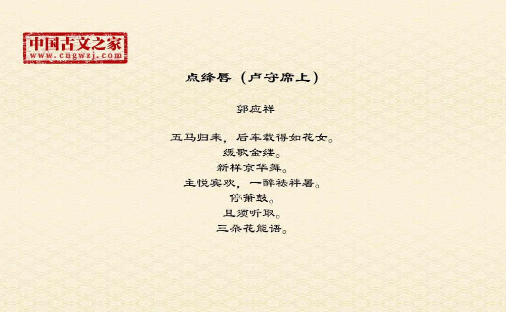 五马归来,后车载得如花女。缓歌金缕。新样京华舞。主悦宾欢,一醉祛袢暑。停箫鼓。且须听取。三朵花能语。