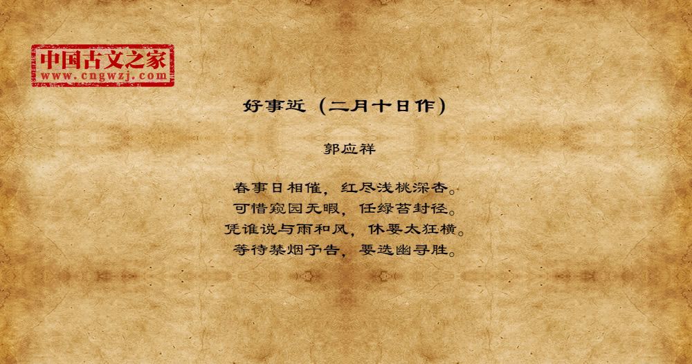 春事日相催,红尽浅桃深杏。可惜窥园无暇,任绿苔封径。凭谁说与雨和风,休要太狂横。等待禁烟予告,要选幽寻胜。