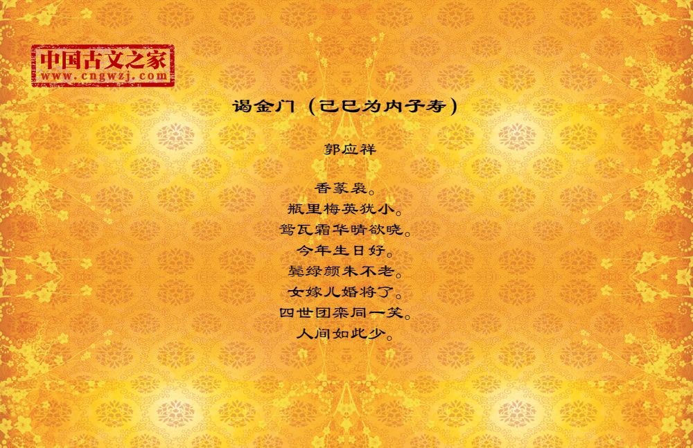 香篆袅。瓶里梅英犹小。鸳瓦霜华晴欲晓。今年生日好。鬓绿颜朱不老。女嫁儿婚将了。四世团栾同一笑。人间如此少。