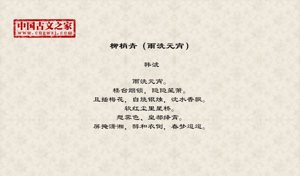 雨洗元宵。楼台烟锁,隐隐笙箫。且插梅花,自烧银烛,沈水香飘。软红尘里星桥。想霁色、皇都绛霄。屏掩潇湘,醉和衣倒,春梦迢迢。