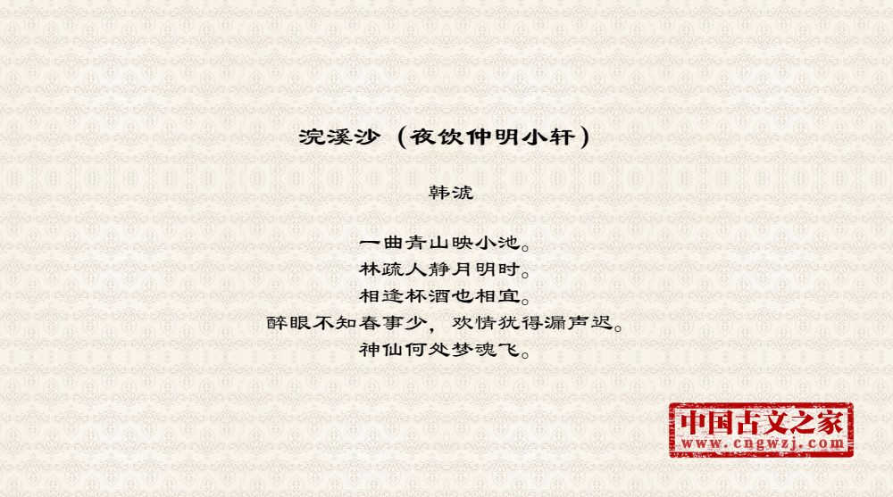 一曲青山映小池。林疏人静月明时。相逢杯酒也相宜。醉眼不知春事少,欢情犹得漏声迟。神仙何处梦魂飞。