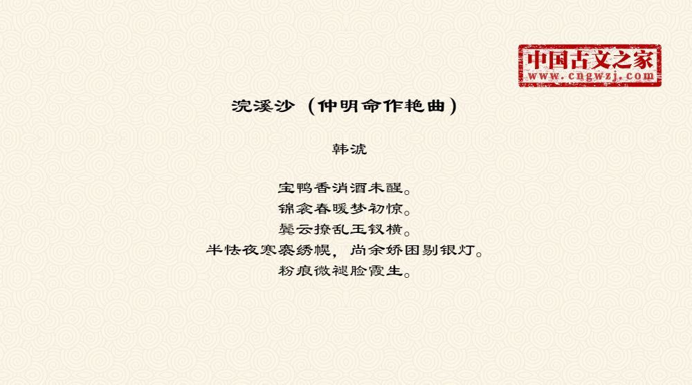 宝鸭香消酒未醒。锦衾春暖梦初惊。鬓云撩乱玉钗横。半怯夜寒褰绣幌,尚余娇困剔银灯。粉痕微褪脸霞生。