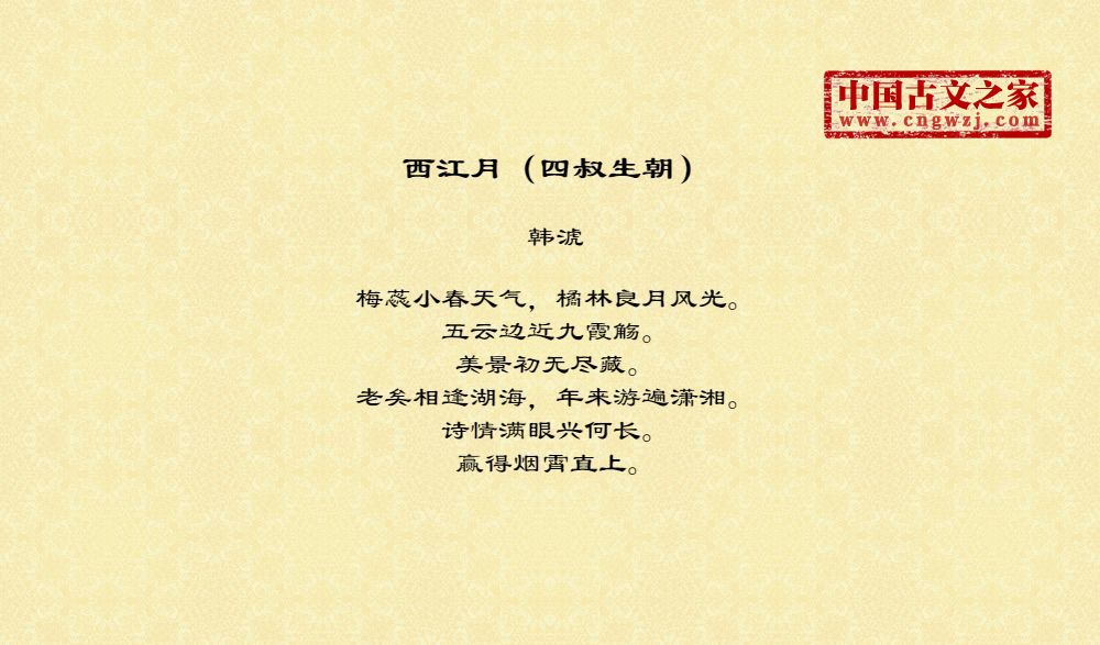 梅蕊小春天气,橘林良月风光。五云边近九霞觞。美景初无尽藏。老矣相逢湖海,年来游遍潇湘。诗情满眼兴何长。赢得烟霄直上。