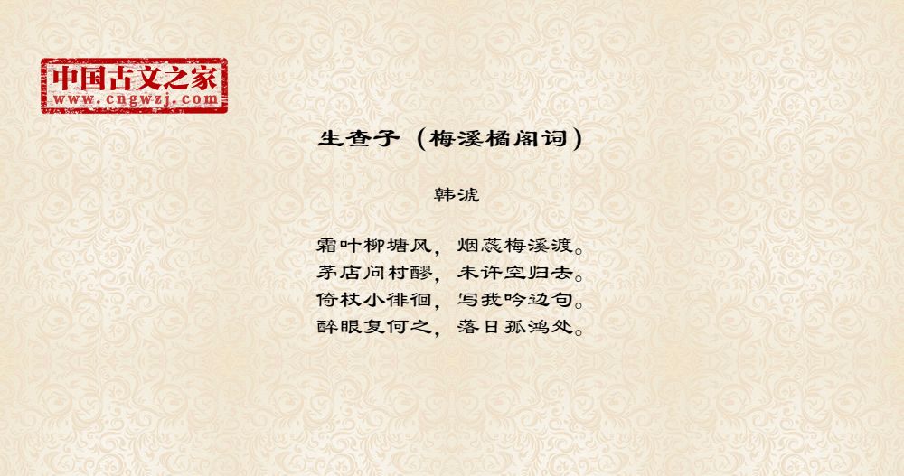 霜叶柳塘风,烟蕊梅溪渡。茅店问村醪,未许空归去。倚杖小徘徊,写我吟边句。醉眼复何之,落日孤鸿处。