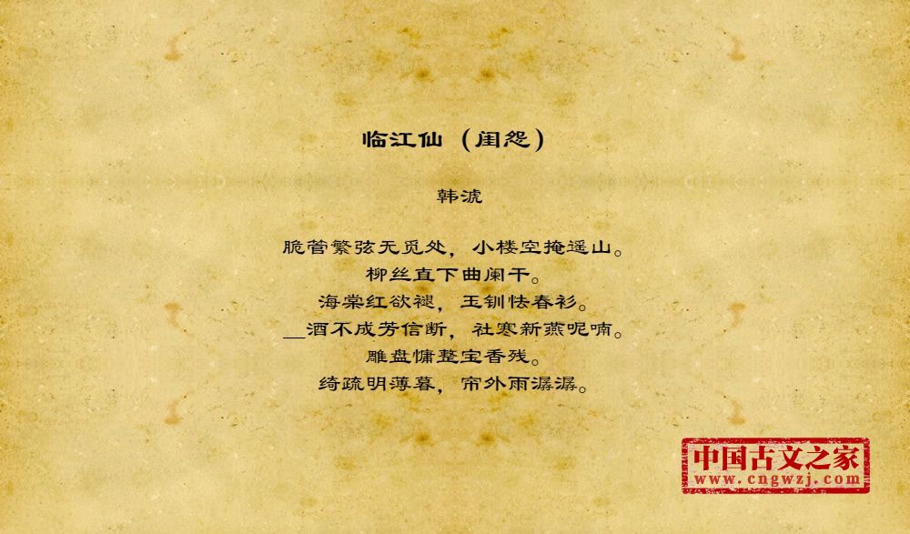 脆管繁弦无觅处,小楼空掩遥山。柳丝直下曲阑干。海棠红欲褪,玉钏怯春衫。_酒不成芳信断,社寒新燕呢喃。雕盘慵整宝香残。绮疏明薄暮,帘外雨潺潺。