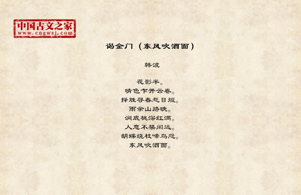 花影半。晴色乍开云卷。择胜寻春愁日短。雨余山路晚。涧底桃深红满。人意不禁闲远。胡蝶绕枝啼鸟怨。东风吹酒面。