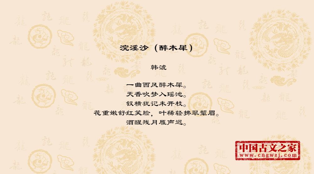 一曲西风醉木犀。天香吹梦入瑶池。钗横犹记未开枝。花重嫩舒红笑脸,叶稀轻拂翠颦眉。酒醒残月雁声迟。
