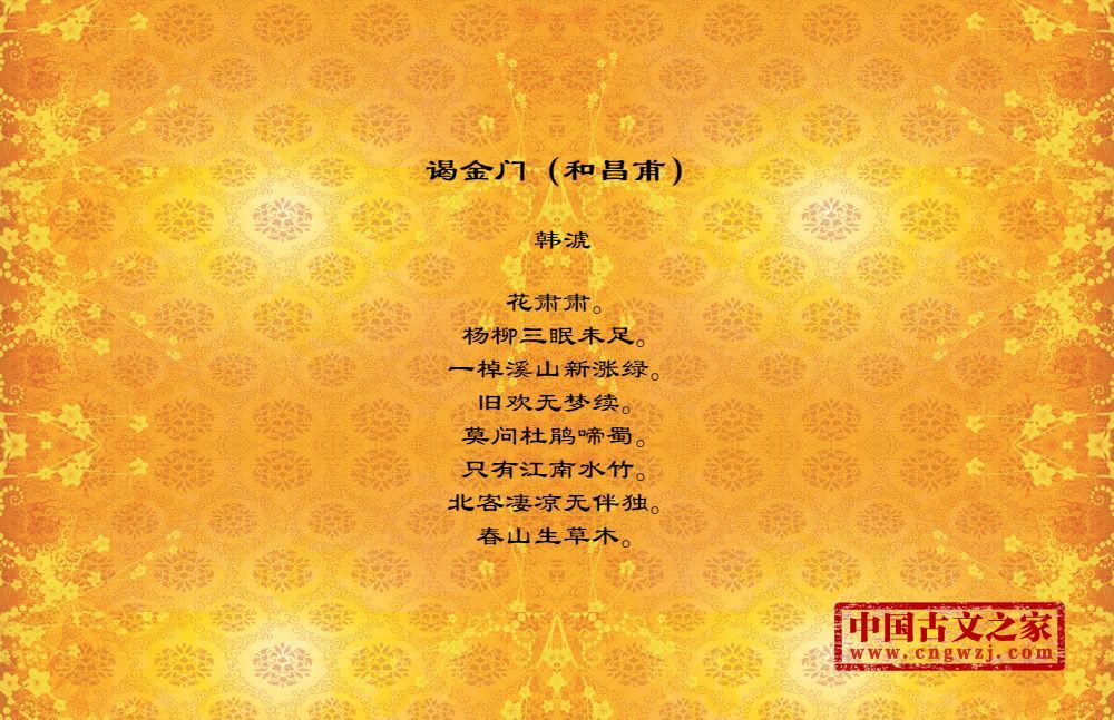 花肃肃。杨柳三眠未足。一棹溪山新涨绿。旧欢无梦续。莫问杜鹃啼蜀。只有江南水竹。北客凄凉无伴独。春山生草木。