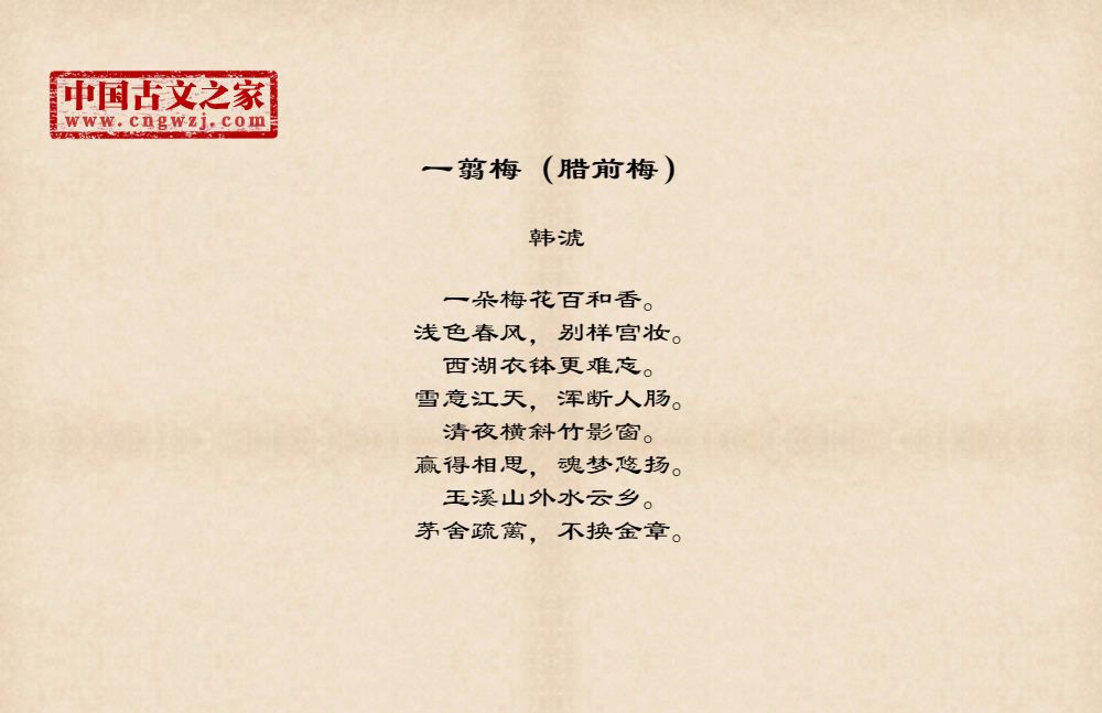 一朵梅花百和香。浅色春风,别样宫妆。西湖衣钵更难忘。雪意江天,浑断人肠。清夜横斜竹影窗。赢得相思,魂梦悠扬。玉溪山外水云乡。茅舍疏篱,不换金章。