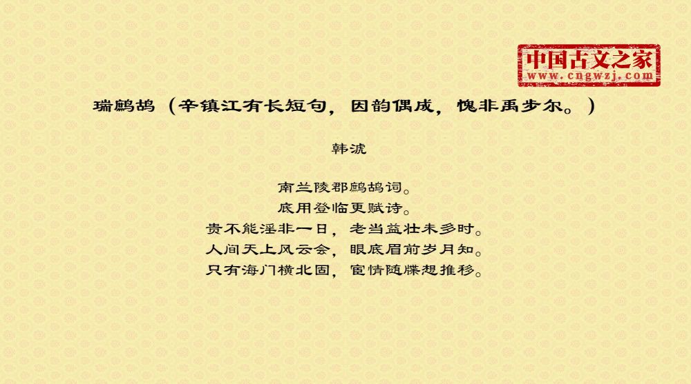 《瑞鹧鸪(辛镇江有长短句,因韵偶成,愧非禹步尔。)》的原文打印版(韩淲)