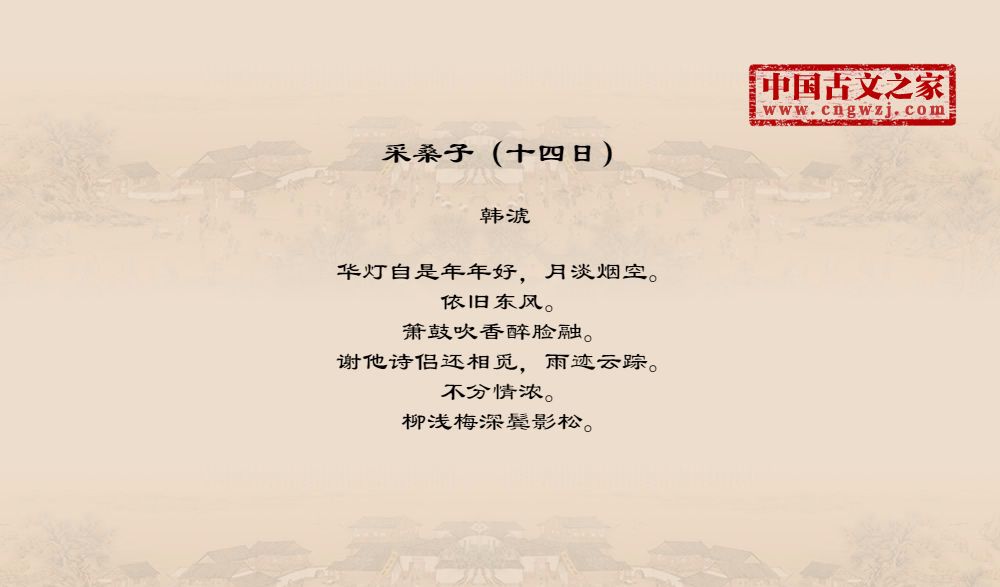 华灯自是年年好,月淡烟空。依旧东风。箫鼓吹香醉脸融。谢他诗侣还相觅,雨迹云踪。不分情浓。柳浅梅深鬓影松。