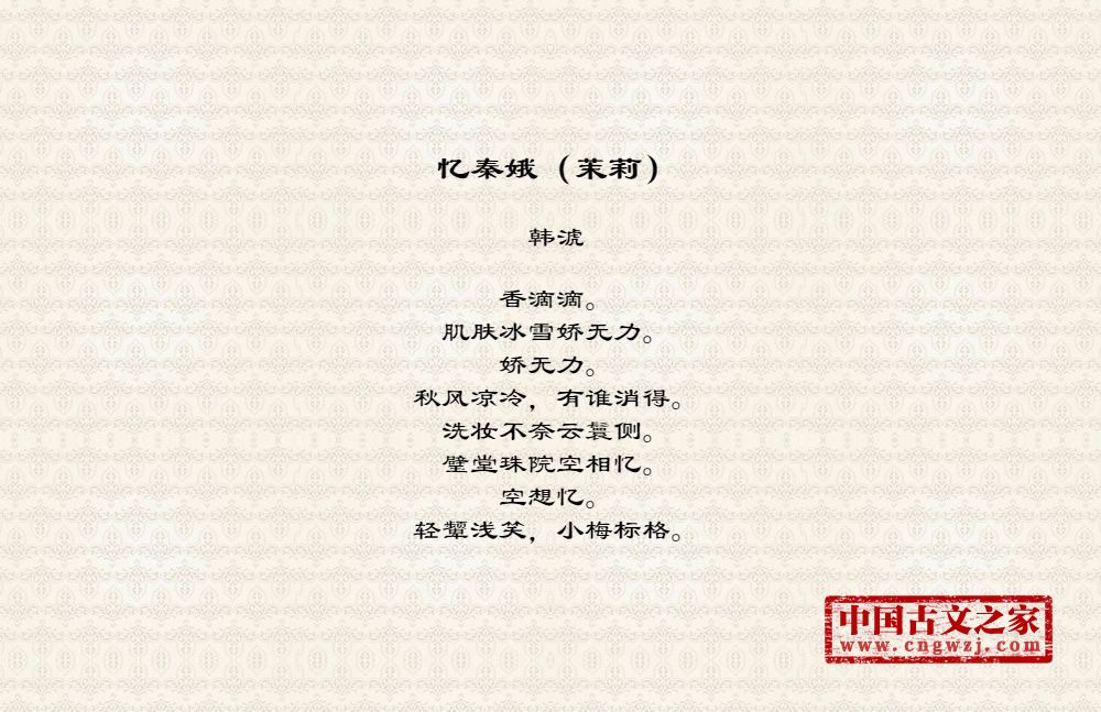 香滴滴。肌肤冰雪娇无力。娇无力。秋风凉冷,有谁消得。洗妆不奈云鬟侧。璧堂珠院空相忆。空想忆。轻颦浅笑,小梅标格。