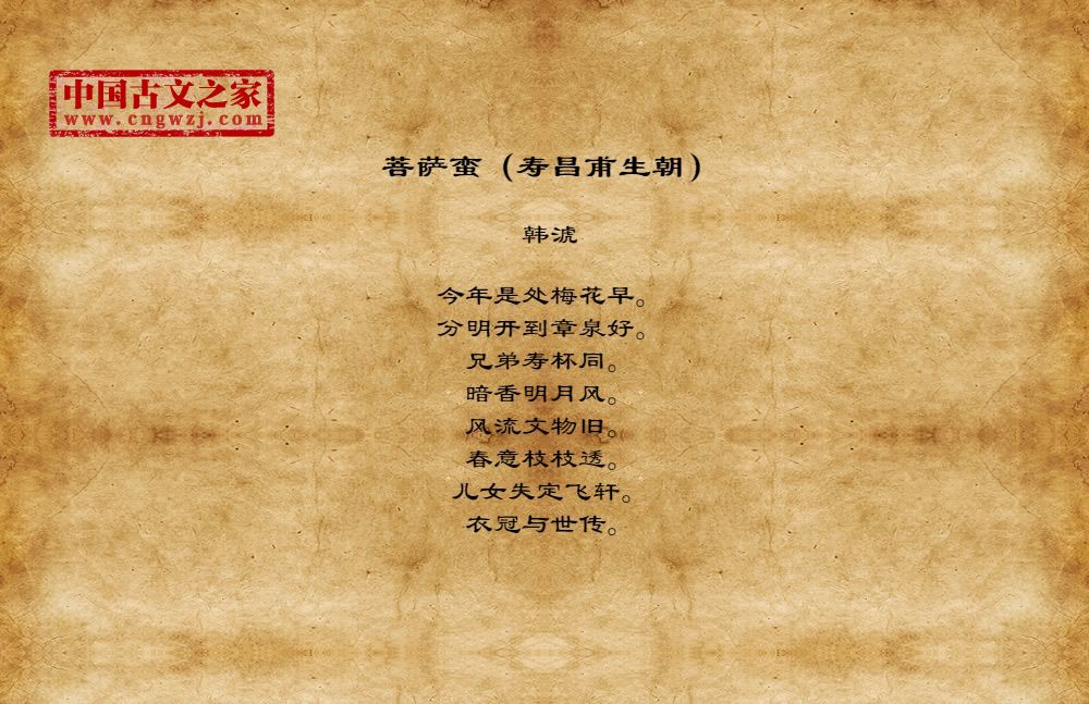 今年是处梅花早。分明开到章泉好。兄弟寿杯同。暗香明月风。风流文物旧。春意枝枝透。儿女失定飞轩。衣冠与世传。