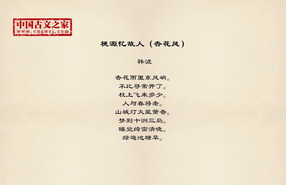 杏花雨里东风峭。不比寻常开了。枝上飞来多少。人与春将老。山城灯火笙箫杳。梦到十洲三岛。睡觉绮窗清晓。绿遍池塘草。