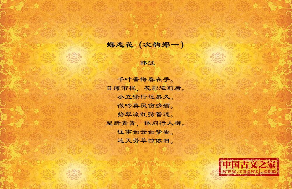 千叶香梅春在手。日薄帘栊,花影遮前后。小立徐行还易久。微吟莫厌伤多酒。拾翠流红弦管透。望断青青,休问行人柳。往事如云如梦否。连天芳草惊依旧。