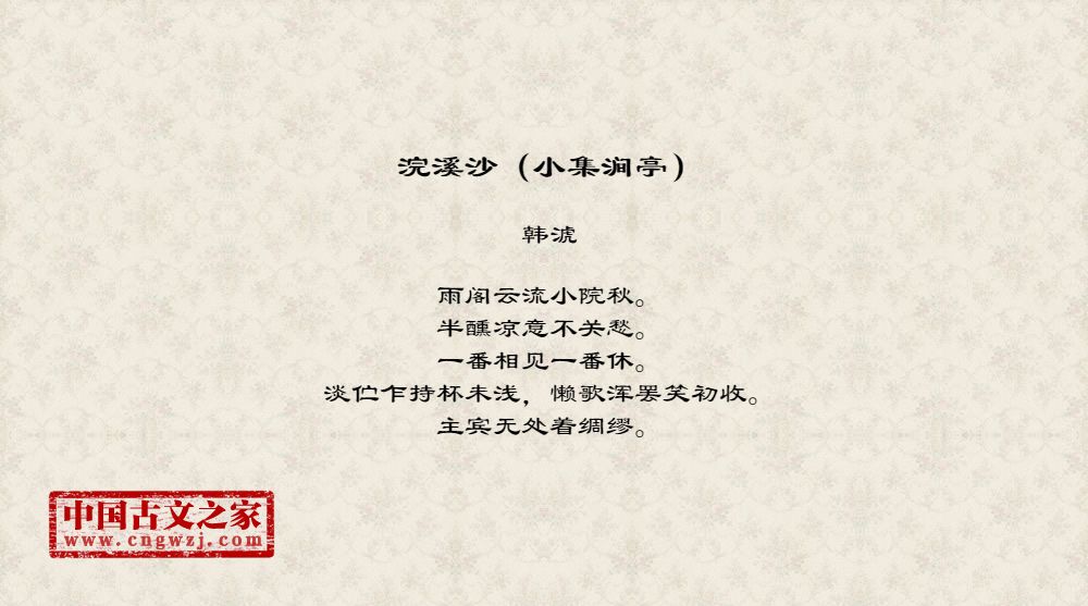 雨阁云流小院秋。半醺凉意不关愁。一番相见一番休。淡伫乍持杯未浅,懒歌浑罢笑初收。主宾无处着绸缪。