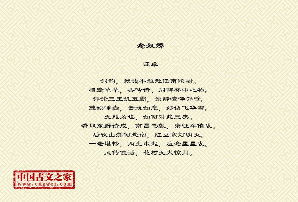 词韵,就饯平叔赴任南陵尉。相逢草草,共吟诗、同醉杯中之物。评论三王讥五霸,谈辩喧哗邻壁。敲缺唾壶,击残如意,妙语飞华雪。无能为也,如何对此三杰。看取东野诗成,南昌书就,奈征车催发。后夜山深何处宿,红豆寒灯明灭。一老堪怜,两生未起,应念星星发。风传佳话,花村无犬惊月。