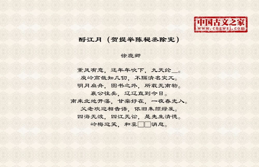 《酹江月(贺提举陈秘丞除宪)》的原文打印版(徐鹿卿)