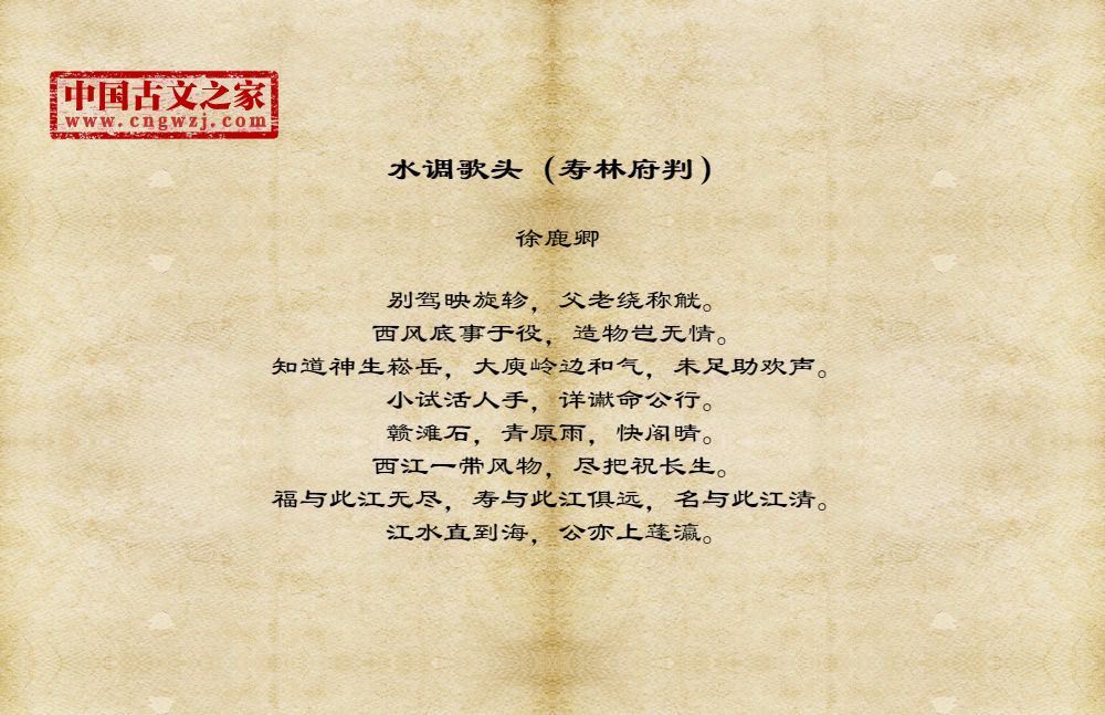别驾映旋轸,父老绕称觥。西风底事于役,造物岂无情。知道神生崧岳,大庾岭边和气,未足助欢声。小试活人手,详谳命公行。赣滩石,青原雨,快阁晴。西江一带风物,尽把祝长生。福与此江无尽,寿与此江俱远,名与此江清。江水直到海,公亦上蓬瀛。