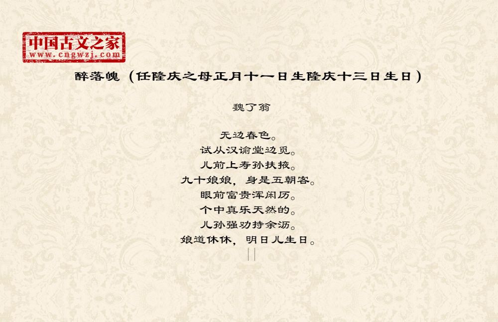 无边春色。试从汉谕堂边觅。儿前上寿孙扶掖。九十娘娘,身是五朝客。眼前富贵浑闲历。个中真乐天然的。儿孙强劝持余沥。娘道休休,明日儿生日。||