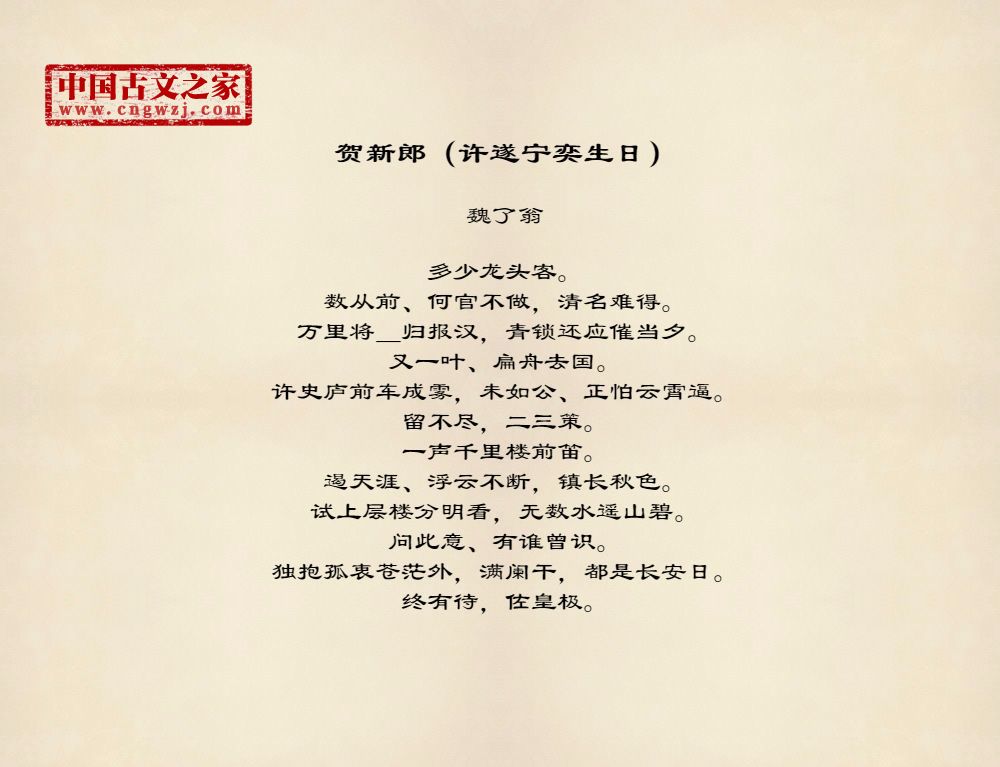 多少龙头客。数从前、何官不做,清名难得。万里将_归报汉,青锁还应催当夕。又一叶、扁舟去国。许史庐前车成雾,未如公、正怕云霄逼。留不尽,二三策。一声千里楼前笛。遏天涯、浮云不断,镇长秋色。试上层楼分明看,无数水遥山碧。问此意、有谁曾识。独抱孤衷苍茫外,满阑干,都是长安日。终有待,佐皇极。