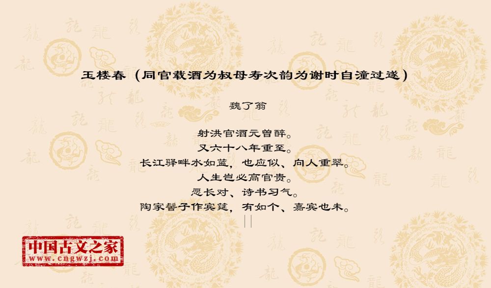 《玉楼春(同官载酒为叔母寿次韵为谢时自潼过遂)》的原文打印版(魏了翁)