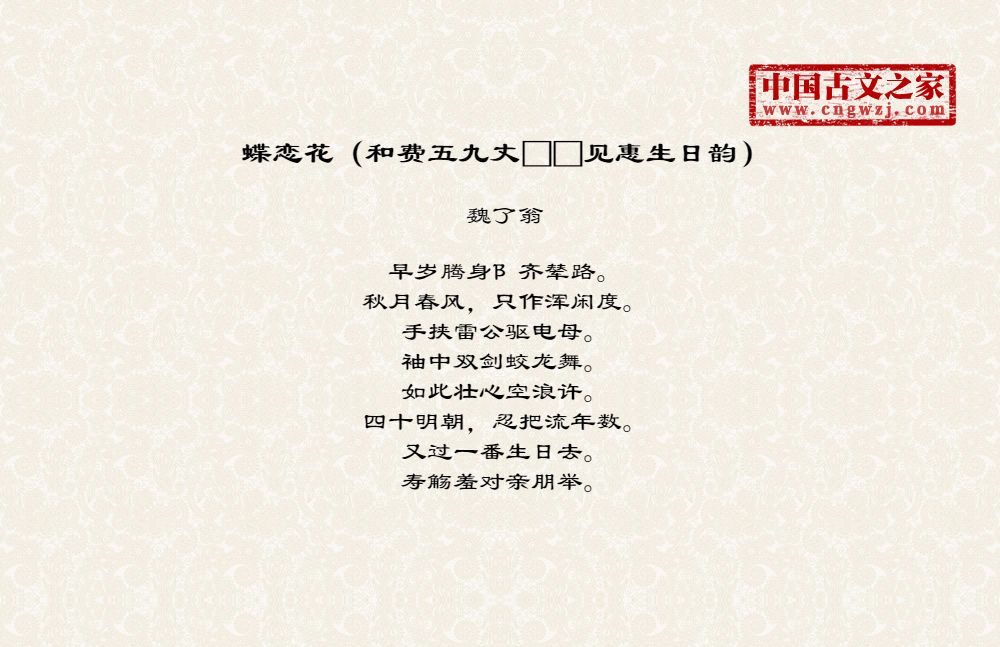 《蝶恋花(和费五九丈□□见惠生日韵)》的原文打印版(魏了翁)