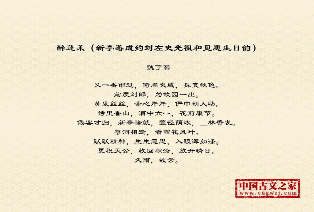 《醉蓬莱(新亭落成约刘左史光祖和见惠生日韵)》的原文打印版(魏了翁)