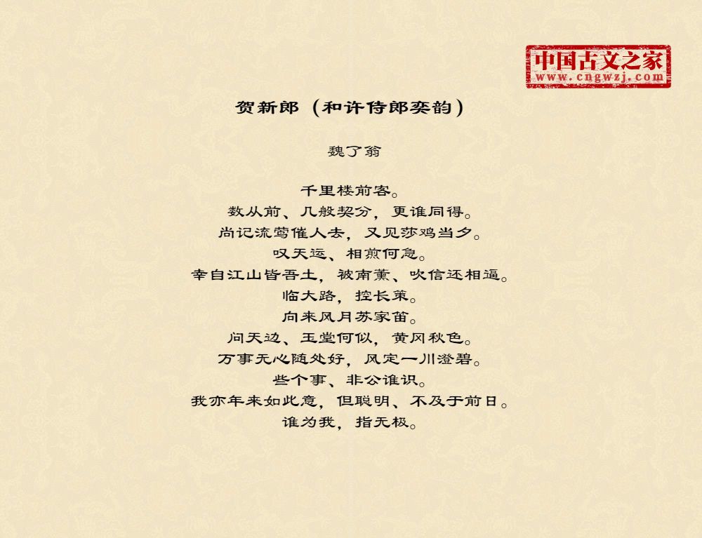 千里楼前客。数从前、几般契分,更谁同得。尚记流莺催人去,又见莎鸡当夕。叹天运、相煎何急。幸自江山皆吾土,被南薰、吹信还相逼。临大路,控长策。向来风月苏家笛。问天边、玉堂何似,黄冈秋色。万事无心随处好,风定一川澄碧。些个事、非公谁识。我亦年来如此意,但聪明、不及于前日。谁为我,指无极。