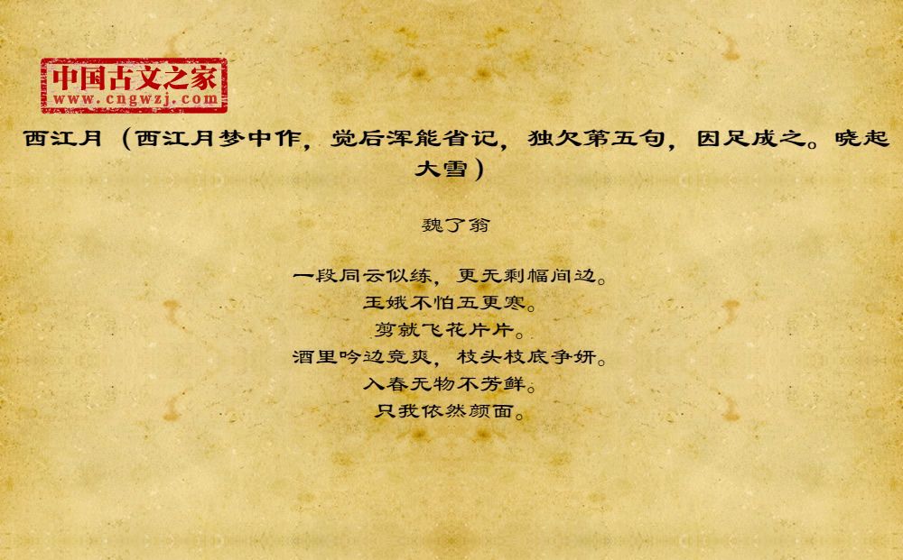 一段同云似练,更无剩幅间边。玉娥不怕五更寒。剪就飞花片片。酒里吟边竞爽,枝头枝底争妍。入春无物不芳鲜。只我依然颜面。