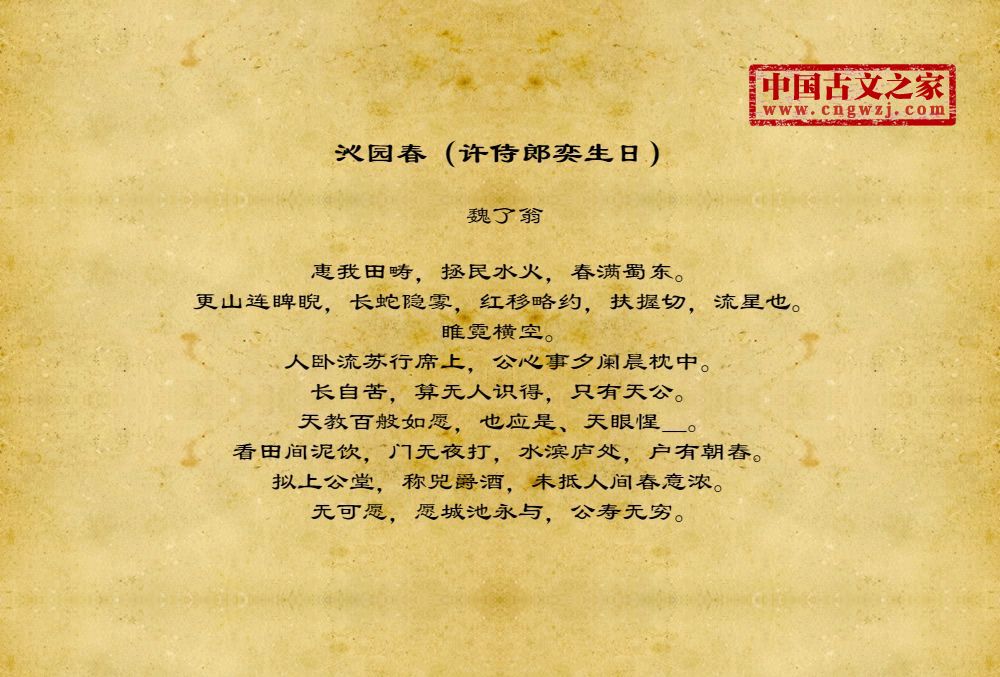惠我田畴,拯民水火,春满蜀东。更山连睥睨,长蛇隐雾,红移略约,扶握切,流星也。睢霓横空。人卧流苏行席上,公心事夕阑晨枕中。长自苦,算无人识得,只有天公。天教百般如愿,也应是、天眼惺_。看田间泥饮,门无夜打,水滨庐处,户有朝舂。拟上公堂,称兕爵酒,未抵人间春意浓。无可愿,愿城池永与,公寿无穷。