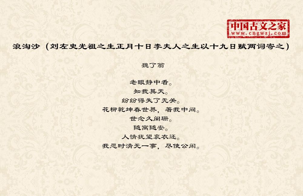 老眼静中看。知我其天。纷纷得失了无关。花柳乾坤春世界,著我中间。世念久阑珊。随寓随安。人情犹望衮衣还。我愿时清无一事,尽使公闲。