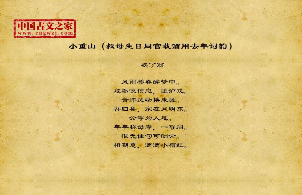 《小重山(叔母生日同官载酒用去年词韵)》的原文打印版(魏了翁)