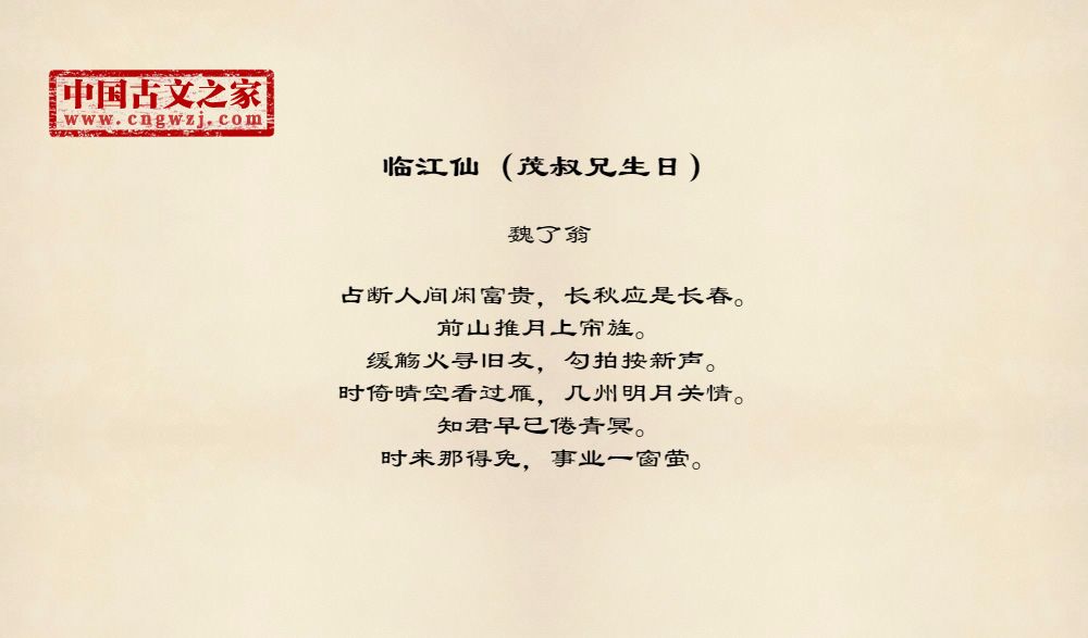 占断人间闲富贵,长秋应是长春。前山推月上帘旌。缓觞火寻旧友,勾拍按新声。时倚晴空看过雁,几州明月关情。知君早已倦青冥。时来那得免,事业一窗萤。