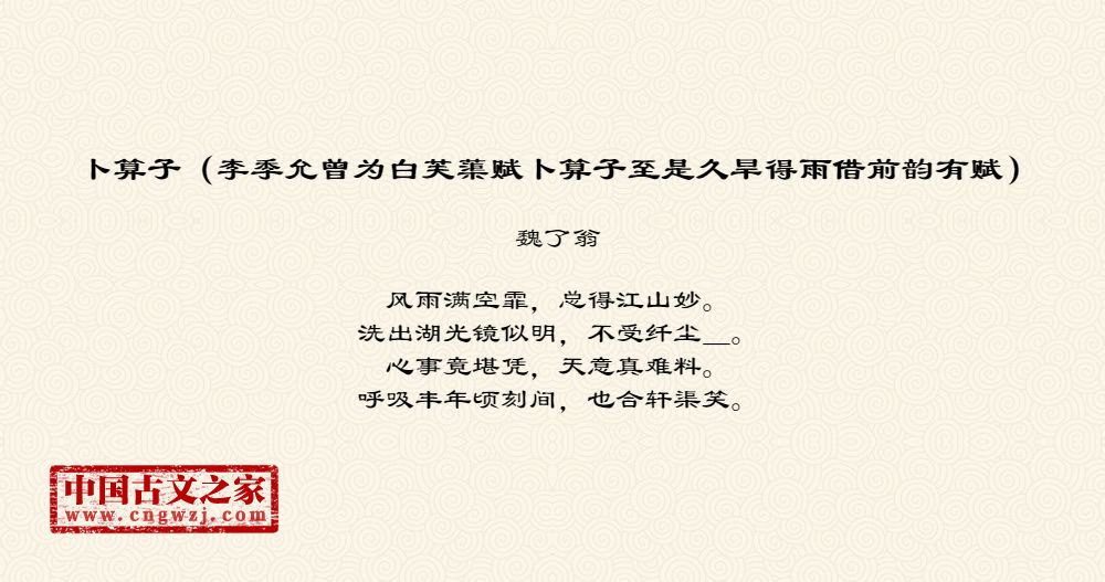 风雨满空霏,总得江山妙。洗出湖光镜似明,不受纤尘_。心事竟堪凭,天意真难料。呼吸丰年顷刻间,也合轩渠笑。