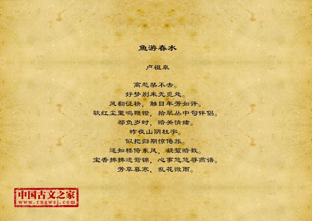 离愁禁不去。好梦别来无觅处。风翻征袂,触目年芳如许。软红尘里鸣鞭镫,拾翠丛中句伴侣。都负岁时,暗关情绪。昨夜山阴杜宇。似把归期惊倦旅。遥知楼倚东风,凝颦暗数。宝香拂拂遗鸳锦,心事悠悠寻燕语。芳草暮寒,乱花微雨。