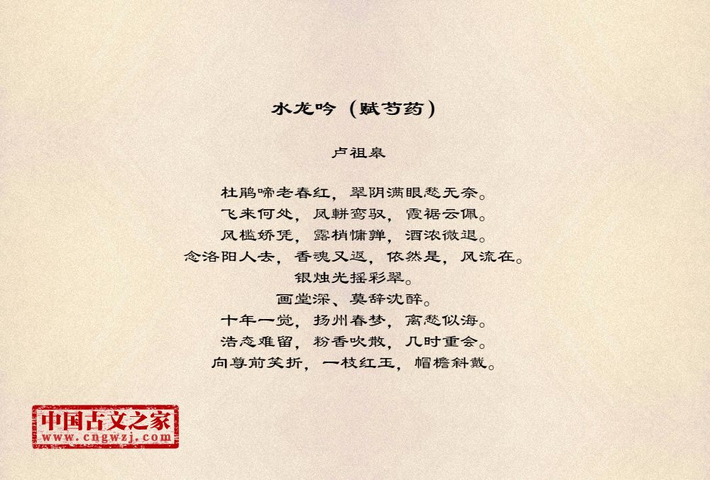 杜鹃啼老春红,翠阴满眼愁无奈。飞来何处,凤軿鸾驭,霞裾云佩。风槛娇凭,露梢慵亸,酒浓微退。念洛阳人去,香魂又返,依然是,风流在。银烛光摇彩翠。画堂深、莫辞沈醉。十年一觉,扬州春梦,离愁似海。浩态难留,粉香吹散,几时重会。向尊前笑折,一枝红玉,帽檐斜戴。