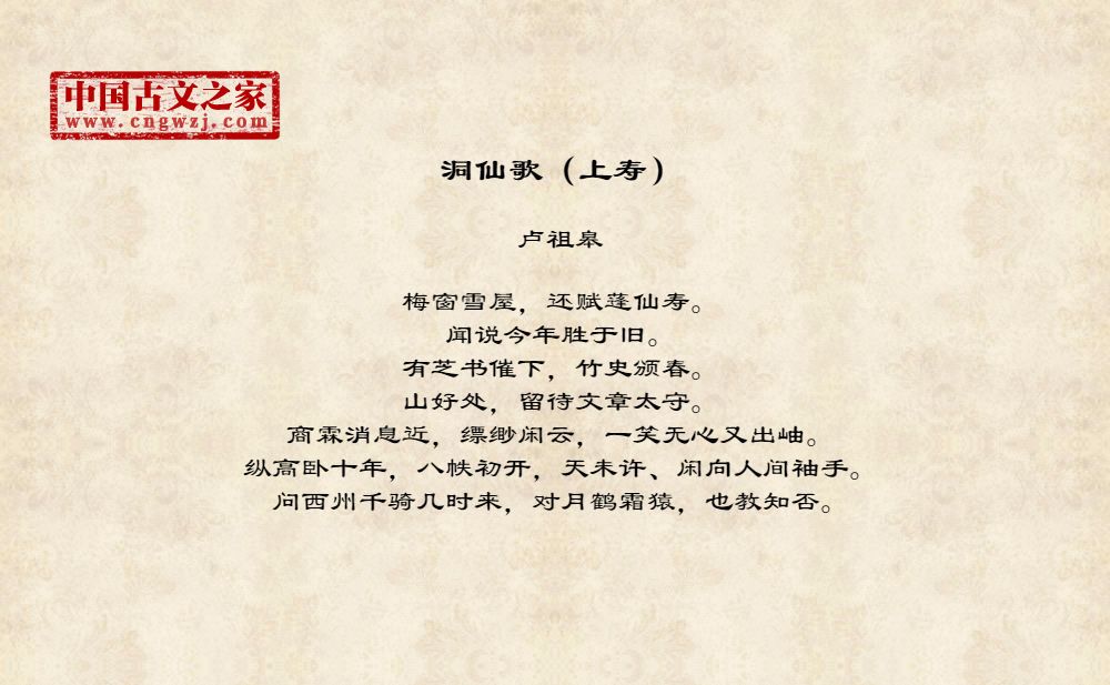 梅窗雪屋,还赋蓬仙寿。闻说今年胜于旧。有芝书催下,竹史颁春。山好处,留待文章太守。商霖消息近,缥缈闲云,一笑无心又出岫。纵高卧十年,八帙初开,天未许、闲向人间袖手。问西州千骑几时来,对月鹤霜猿,也教知否。