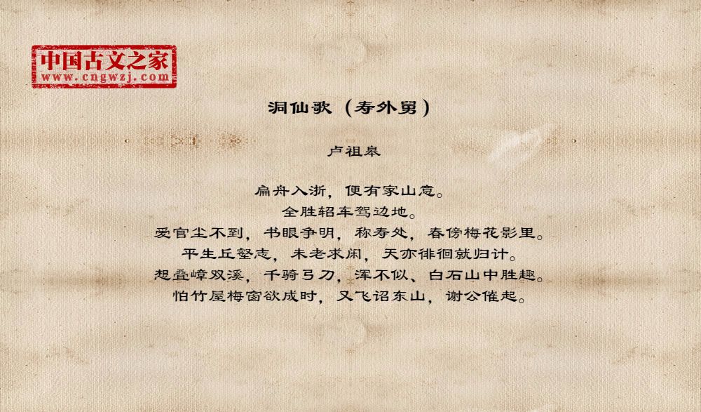 扁舟入浙,便有家山意。全胜轺车驾边地。爱官尘不到,书眼争明,称寿处,春傍梅花影里。平生丘壑志,未老求闲,天亦徘徊就归计。想叠嶂双溪,千骑弓刀,浑不似、白石山中胜趣。怕竹屋梅窗欲成时,又飞诏东山,谢公催起。
