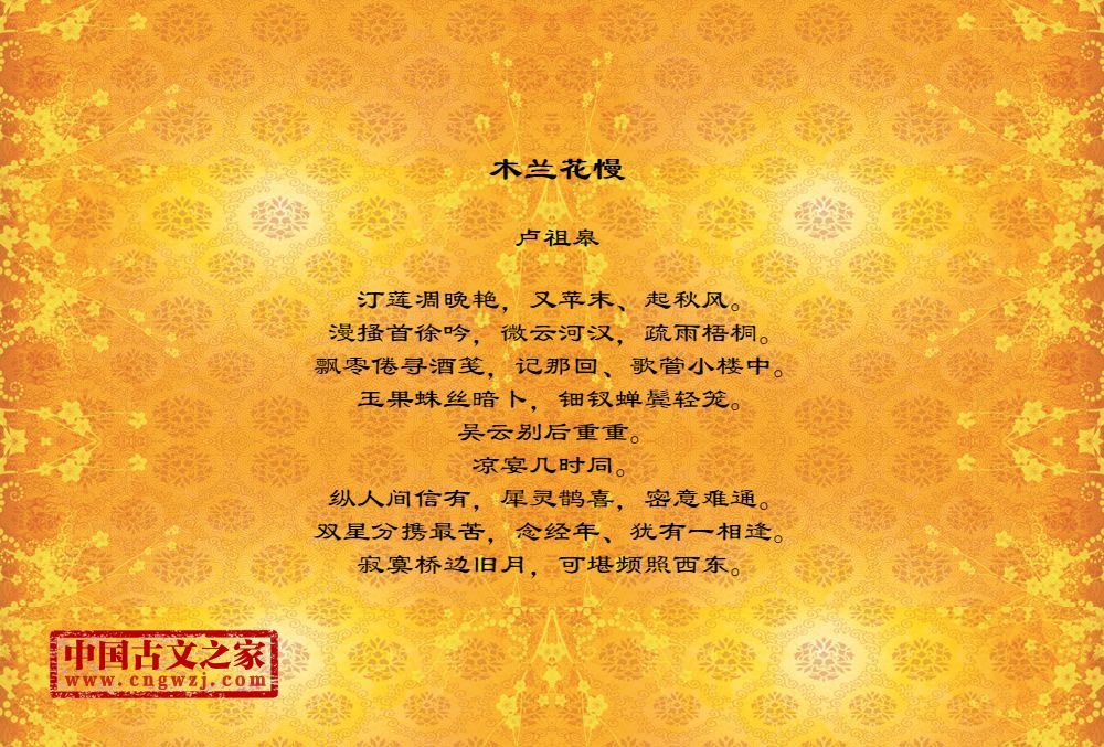 汀莲凋晚艳,又苹末、起秋风。漫搔首徐吟,微云河汉,疏雨梧桐。飘零倦寻酒笺,记那回、歌管小楼中。玉果蛛丝暗卜,钿钗蝉鬓轻笼。吴云别后重重。凉宴几时同。纵人间信有,犀灵鹊喜,密意难通。双星分携最苦,念经年、犹有一相逢。寂寞桥边旧月,可堪频照西东。