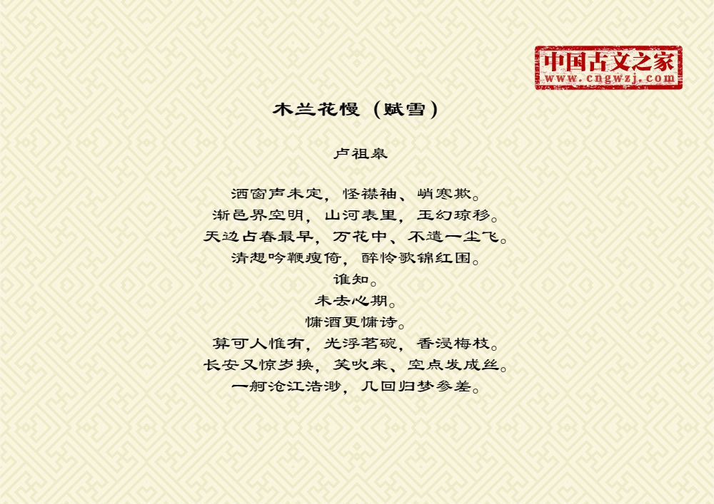 洒窗声未定,怪襟袖、峭寒欺。渐邑界空明,山河表里,玉幻琼移。天边占春最早,万花中、不遣一尘飞。清想吟鞭瘦倚,醉怜歌锦红围。谁知。未去心期。慵酒更慵诗。算可人惟有,光浮茗碗,香浸梅枝。长安又惊岁换,笑吹来、空点发成丝。一舸沧江浩渺,几回归梦参差。