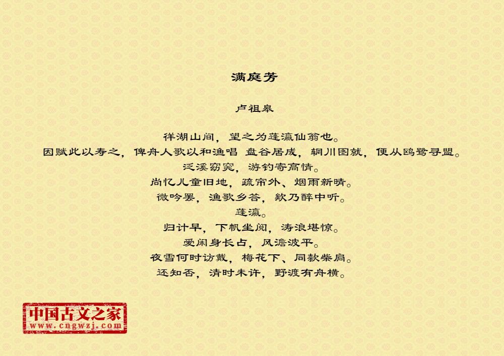 徉湖山间,望之为蓬瀛仙翁也。因赋此以寿之,俾舟人歌以和渔唱 盘谷居成,辋川图就,便从鸥鹭寻盟。泛溪窈窕,游钓寄高情。尚忆儿童旧地,疏帘外、烟雨新晴。微吟罢,渔歌乡答,欸乃醉中听。蓬瀛。归计早,下帆坐阅,涛浪堪惊。爱闲身长占,风澹波平。夜雪何时访戴,梅花下、同款柴扃。还知否,清时未许,野渡有舟横。