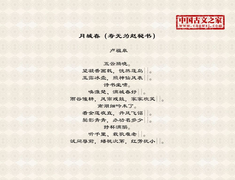 五云腾晓。望凝香画戟,恍然蓬岛||。玉露冰壶,照神仙风表||。诗书坐啸。唤淮楚、满城春好||。雨谷催耕,风帘戏鼓,家家欢笑||。南湖细吟未了。看金莲夜直,丹凤飞诏||。鬓影青青,办功名多少||。持杯满釂。听千里、载歌难老||。试问尊前,蟠桃次第,红芳犹小||。