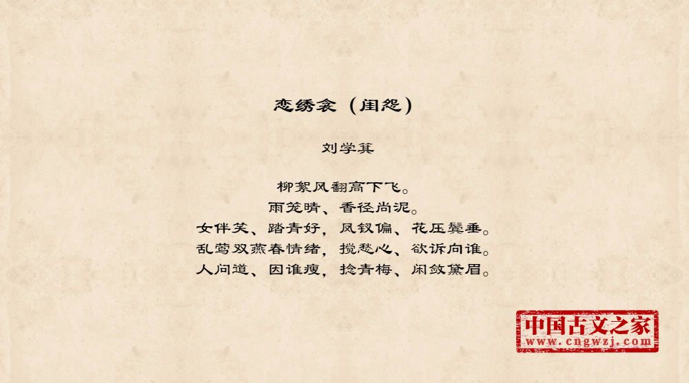 柳絮风翻高下飞。雨笼晴、香径尚泥。女伴笑、踏青好,凤钗偏、花压鬓垂。乱莺双燕春情绪,搅愁心、欲诉向谁。人问道、因谁瘦,捻青梅、闲敛黛眉。