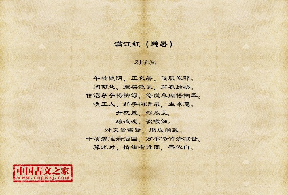 午转槐阴,正炎暑、侵肌似醉。问何处、披襟散发,解衣扬袂。傍沼茅亭杨柳绿,倚崖草阁梧桐翠。唤玉人、纤手掬清泉,生凉意。开枕簟,浮瓜芰。琼液浅,歌喉细。对文禽雪鹭,助成幽致。十顷碧莲潇洒国,万竿修竹清凉世。算此时、情绪有谁同,吾侬自。