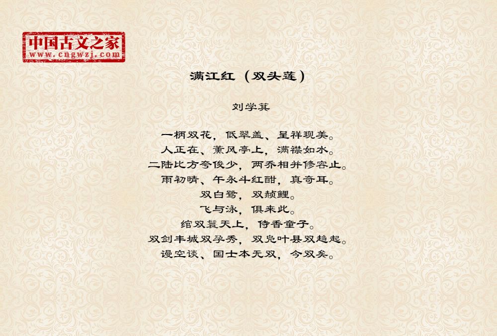 一柄双花,低翠盖、呈祥现美。人正在、薰风亭上,满襟如水。二陆比方夸俊少,两乔相并修容止。雨初晴、午永斗红酣,真奇耳。双白鹭,双赪鲤。飞与泳,俱来此。绾双鬟天上,侍香童子。双剑丰城双孕秀,双凫叶县双趋起。谩空谈、国士本无双,今双矣。