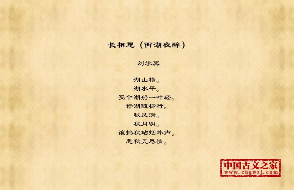 湖山横。湖水平。买个湖船一叶轻。傍湖随柳行。秋风清。秋月明。谁捣秋砧烟外声。悲秋无尽情。